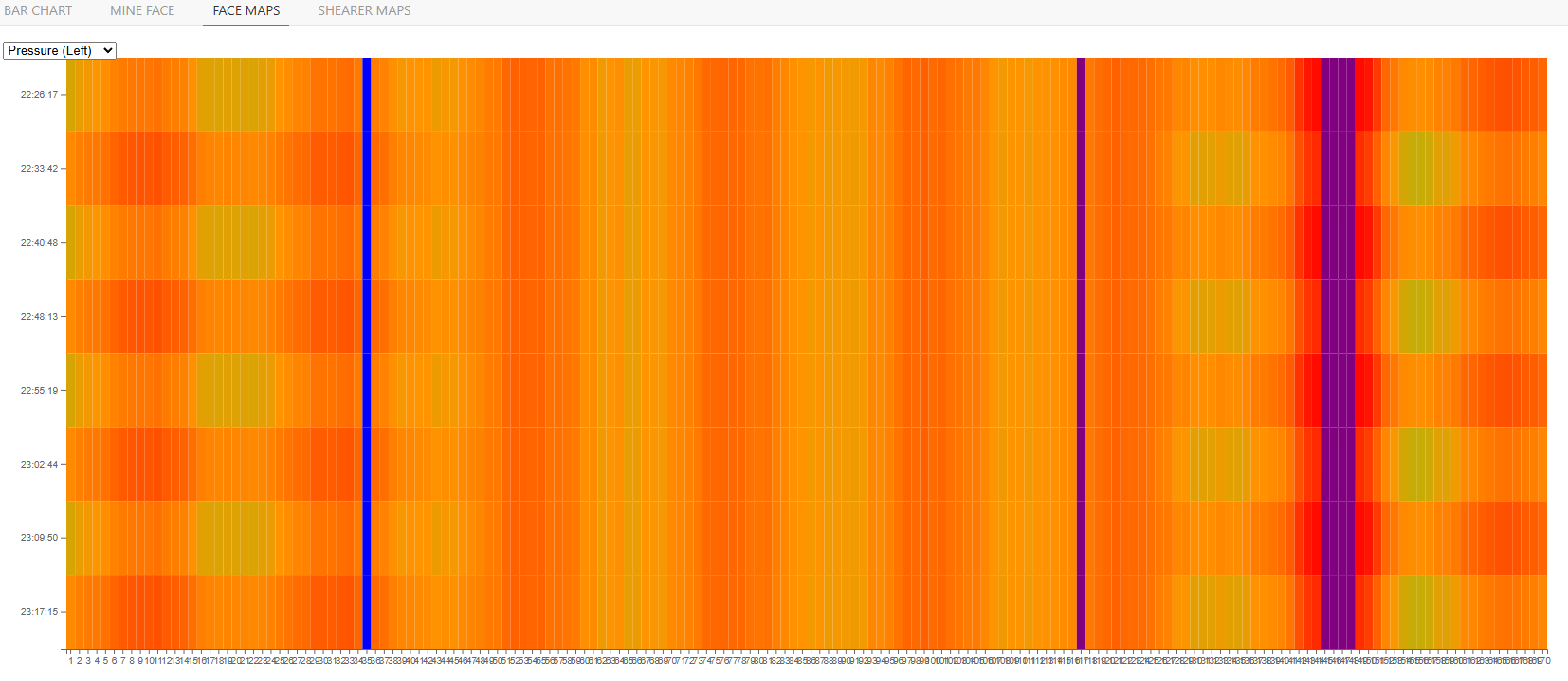 The third display in the Face Display application creates Face Maps ( or shear heatmaps ). These are heatmaps that show you the average value of any given roof support property from shear to shear, letting you see progressive changes in the condition of the longwall over time.