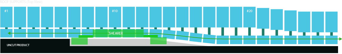 The Shearer is a machine that runs up and down this line, mining the face as it moves. After the shearer passes, the roof supports 'advance' by dropping down off the roof and pulling themselves forwards - letting the longwall 'walk' forward into the seam so the shearer can cut more product.
