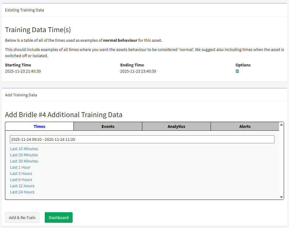 The Upload Sample Times button allows you to upload a CSV list of start and end-times that can be used as examples of 'normal' operation.
